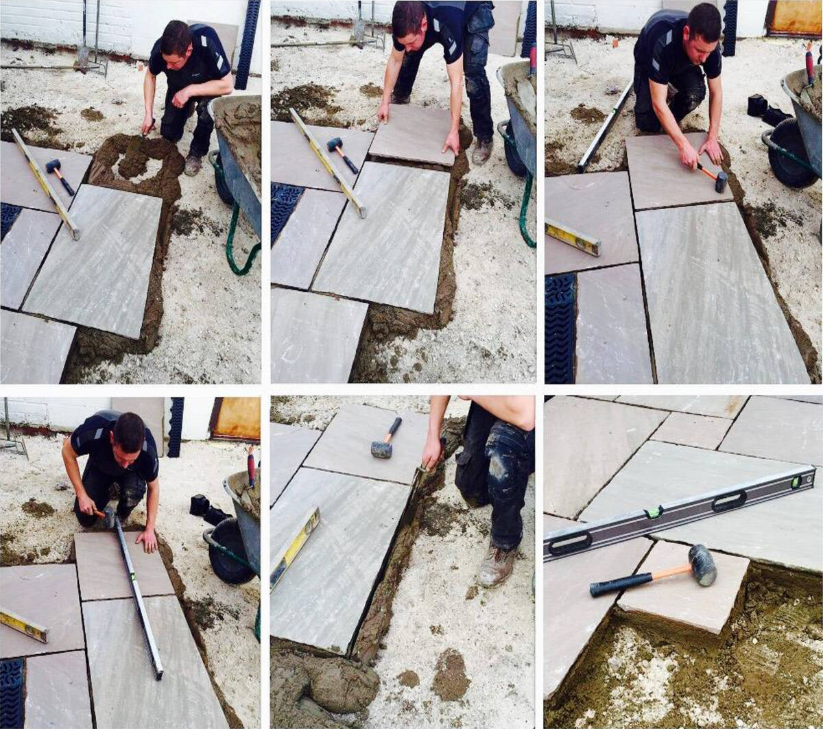 - Paving stones such as Indian Sandstone paving, should be carefully laid on top of the mortar mix, tap into place using rubber mallet. Place next flag with an adequate joint and continue with appropriate laying guide.